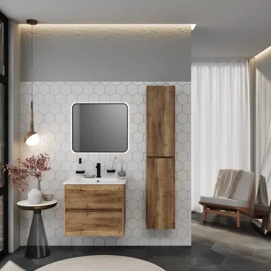 The Marilyn Vanity Unit's wall-hung design optimizes floor space and imparts a rustic oak-effecct aesthetic to your bathroom.